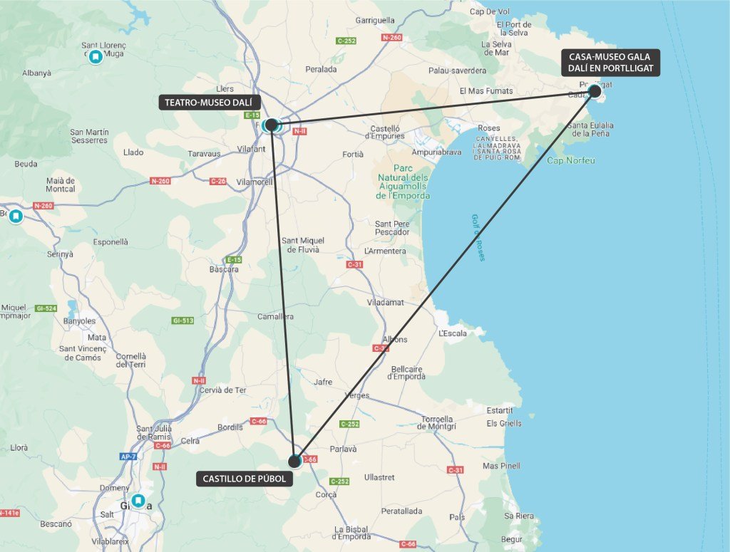 Quiero introducirte un concepto tangible y un poco mítico antes de seguir, el triángulo dalineano. El triángulo dalineano es la figura que se formaría en un mapa sobre la región empordanesa de Catalunya, si con líneas uniéramos tres lugares clave que marcaron la vida del genio del surrealismo: Púbol (Castillo de Púbol), Portlligat (Casa-Museo Gala Dalí) y Figueres (Teatro-Museo Dalí). Este espacio comprende unos 40 metros cuadrados de influencias; a través de leyendas, arquitectura, naturaleza, gastronomía, costumbres… al universo surrealista de la obra de Salvador Dalí.